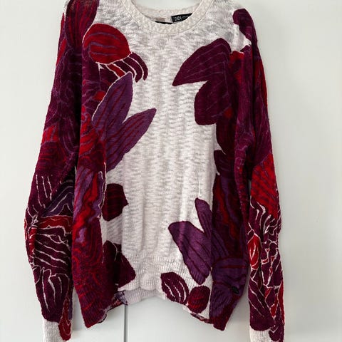 Ohut pitkähihainen kuvioneule, pyöreä pääntie. Vähän käytetty, pinnassa hieman nukkaantumista (kts. kuva).