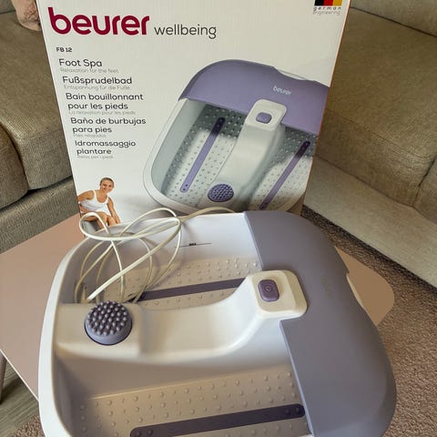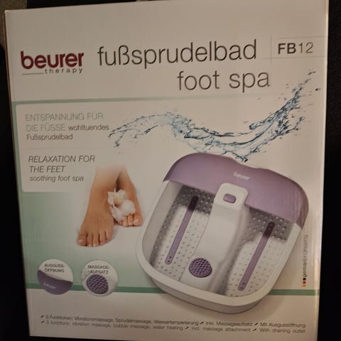 Beurer jalkakylpylaite. Sähköinen jalkakylpy, jossa hierovia nystyröitä ja kuplatoiminto veden kanssa käytettäväksi. Soveltuu jalkojen liotukseen ja rentouttavaan jalkahoitoon kotikäytössä. Laitteessa on kannettava allas, johon jalat asetetaan lämpimään veteen. Toiminnot ja tarkemmat asetukset ilmenevät käyttöohjeesta ja pakkauksesta.