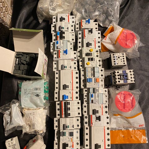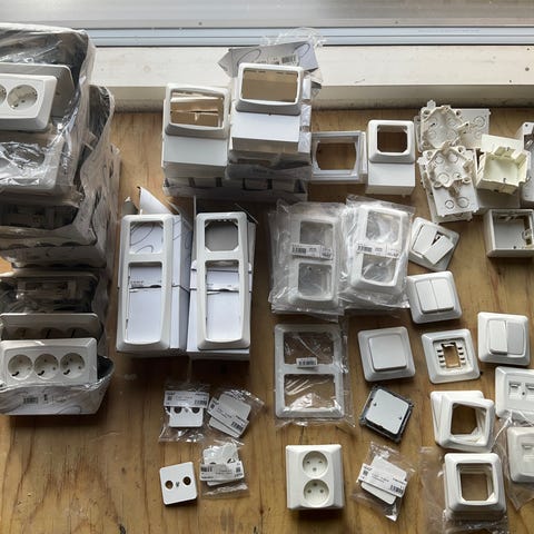 Kuvien mukaisia sähkötarvikkeita, melkein kaikki uusia, joku käytetty on voinut tulla mukaan. Kaikki kerralla