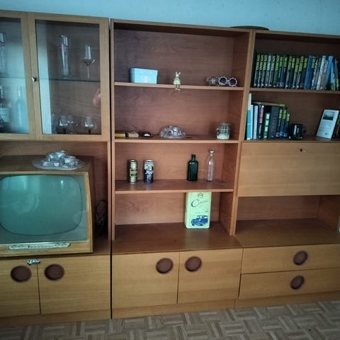 180 cm leveä ja 165 korkea koivukirjahylly. Keskellä sivuun vedettävät vaneri- ja lasiovet.Helppo purkaa ja koota.