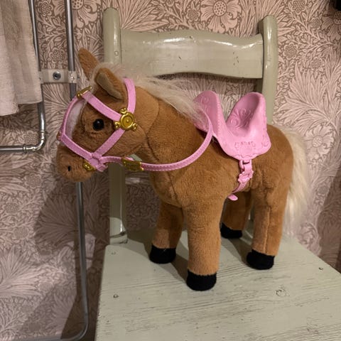 Baby Bornin kävelevä ja ääntä pitävä hevonen. Liikkuu eteenpäin ja liikkuessa kuuluu kavioiden kopsetta. Toimii, juuri testattu ja uudet paristot vaihdettu. Hyvä kunto kaikin puolin.