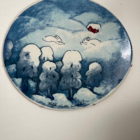 Arabia Kekkonen juhlalautanen sinistä lasitettua posliinia. Lautasen takapuolella on ripustuslenkki.