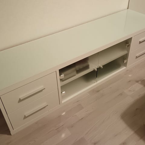 Siistikuntoinen tv-taso, joitain käytön jälkiä näkyy. Kaappien ovissa magneettikiinnitys.