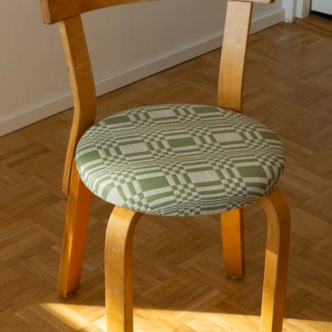 Arkkitehti Alvar Aallon suunnittelema nelijalkainen E60 jakkara verhoiltuna Johanna Gullichsen Doris mantelin värisellä kankaalla 🌳