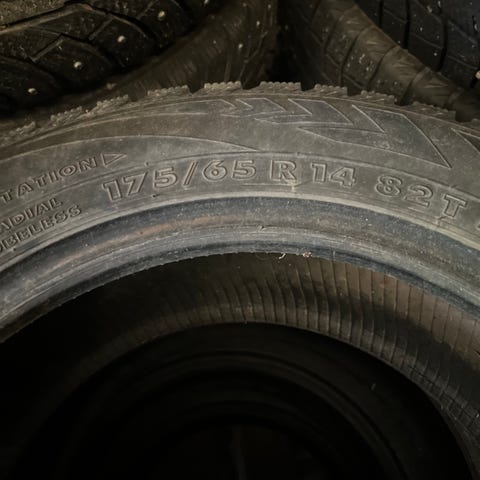 Kuvan nastarenkaat. Nastoja uupuu. 6-7mm pintaa. Salossa, Rekijoella.