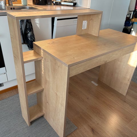 Puinen työpöytä laatikoilla.