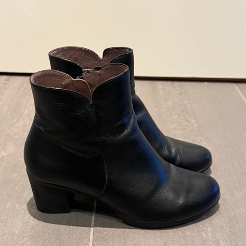 Tyylikkäät mustat korolliset nahkanilkkurit. Tosi tukevat kävellä, korko n. 8cm. Hyvässä kunnossa, nahan pinnassa ei kulumaa sekä korkolapuissakin vielä hyvin kävelyvaraa. Upea kontrastinahka kengän takaosassa.
