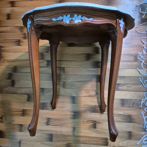Pieni pyöreä puinen sivupöytä. Pöydässä on koristeellisesti muotoiltu jalka ja kolme tukijalkaa. Kunto kohtuullinen.