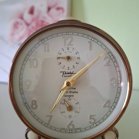 Zuiver Flip Calendar -pöytäkello. Kellossa on analoginen kello sekä flip-kalenteri (kuukausi, viikonpäivä ja päivämäärä). Toimii paristolla ja kaikki mekanismit toimivat normaalisti.