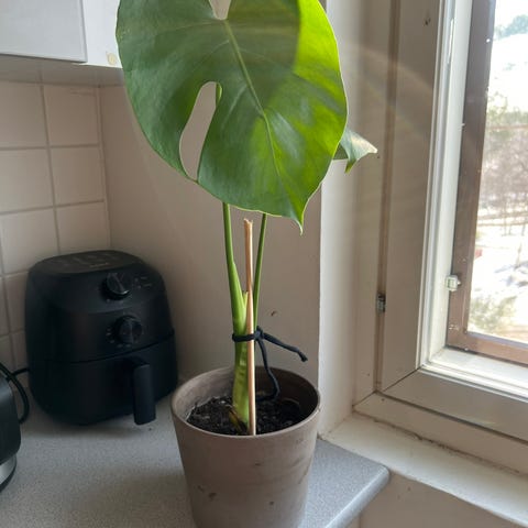Tästä persoonallisen näköinen tyyppi kasvun ihmeellisyyden seurantaan. Lehden päässä vähän kuivaa. Irroitettu emokasvista juurien kera ja istutettu samantien 8.3.