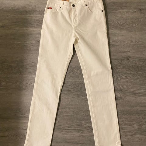 Uudet, vain kerran sovitetut, nyt itselle tarpeettomat. Hieman joustavaa kangasta elastaanin ansiosta. Vyötärö 29" ja pituus 30".