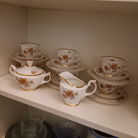 Kahvikupeissa, tasseissa ja aseteissa kultauksessa kulumaa.