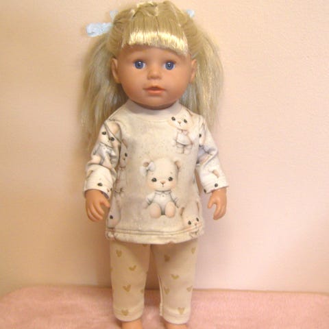 43 cm nukelle (baby born tai sister) joustocollegesta kuviollinen huppari, jossa edessä vetoketu. Hupun reunassa ja vyötäröllä resori. Trikoohousuissa vyötäröllä kuminauha.