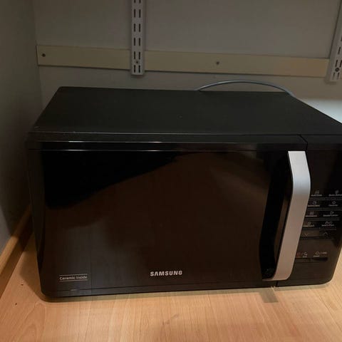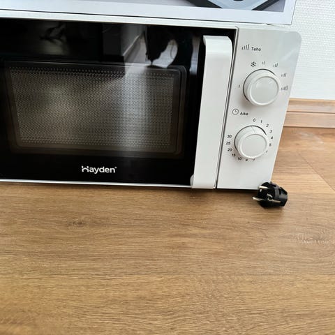 Hyväkuntoinen mikroaaltouuni, jossa pyörivä alusta.