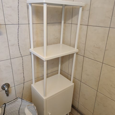 Näppärä kulma- tai allashylly kylpyhuoneeseen tai muuhun säilytykseen. Ylimmällä tasolla pieni haalentuma, ei näy häiritsevästi käytössä. Kunnossa ei muita moitteita. Nouto Vallilasta!