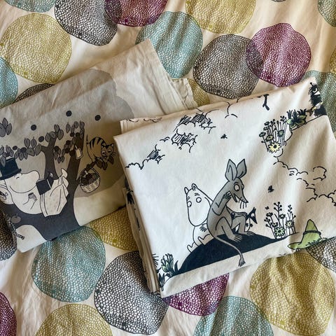 Muumeissa värit jo hieman pesussa haalistuneet. Autot tyynyliinan kulmasaumassa pieni purkauma.