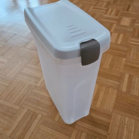 Muovinen ruuan säilytysastia esim. koiran nappuloille. Pyörät alla. Hyvä kuntoinen, ostettu pari kuukautta sitten eläin kaupasta. Kulkeutuu omien menojen mukana Saloon ja Turkuun.