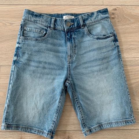 Lindex farkkushortsit, koko 152. Materiaalina denim, väri sininen vaalealla pesulla. Shortseissa vyötärönauhassa vyölenkit, nappi- ja vetoketjukiinnitys sekä etu- ja takataskut. Lahkeensuut ovat käännetyt.