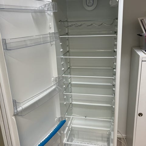 AEG jääkaappi teräspintaisella ovella. Korkea kaappimalli, jossa useita säädettäviä lasihyllyjä, vihanneslaatikko sekä ovihyllyt pulloille ja pienemmille tuotteille. Etupaneelissa elektroninen lämpötilanäyttö ja -säätimet. Vain nouto sovitusti