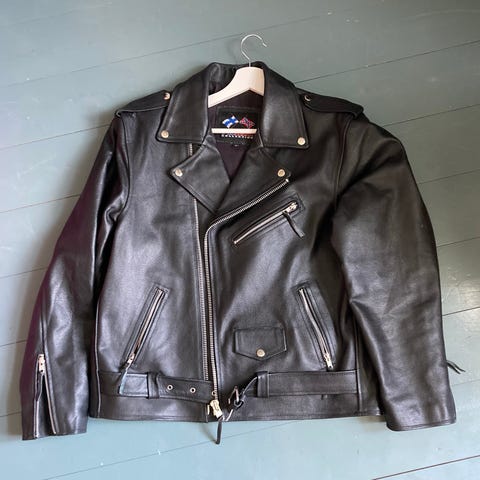 70-luvun prätkätakki paksua nahkaa, ei suojia.