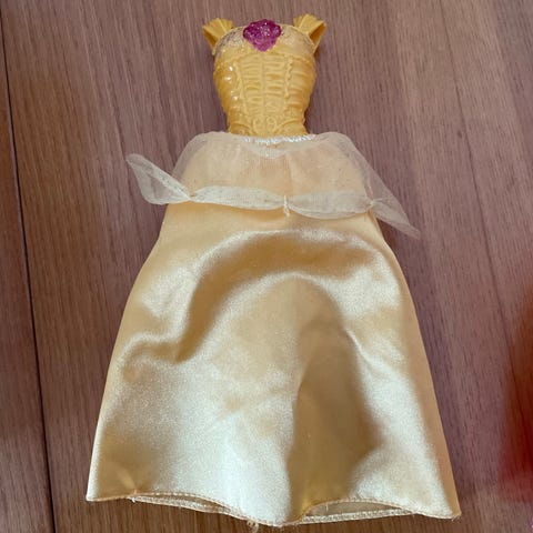 Disney nuken mekko. Vaaleanpunainen juhlatyylinen mekko, jossa kiiltävä helma ja koristeltu yläosa. Sopii Disney-tyyliselle nukelle rooli- ja prinsessaleikkeihin, luultavasti myös Barbielle.