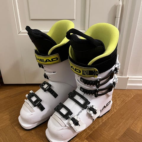 Head Raptor 40 laskettelumonot, väri valkoinen. Monon pohjan pituus 237 mm ja mondo-koko MP 19.5. Sopii lasketteluun esimerkiksi lapselle tai pienijalkaiselle käyttäjälle. Kuvissa näkyy lisäksi laskettelusukset rossignol 94