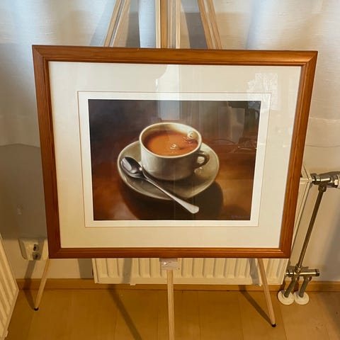 Ikean kehys (52,5 x 72,5 x 3 cm), paksu passepartout ja Kaj Stenvallin ankkajuliste. Ei mitään vikaa. Joku pieni roska päätynyt lasin ja paspiksen väliin.