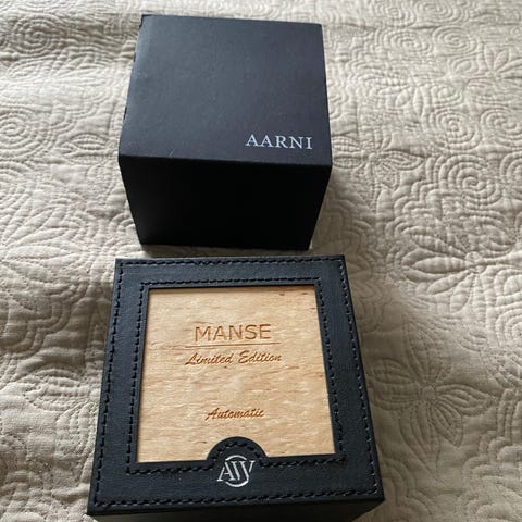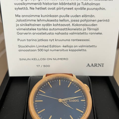 Aarni Manse Limited Edition miesten rannekello. Kellossa on vihreä kellotaulu, jossa näkyvä koneisto-osio. Kuori ja ranneke ovat puun ja metallin yhdistelmää kullan sävyssä. Mekaaninen automaattikoneisto näkyy osittain kellotaulun läpi. Malli on numeroitu erikoiserä, jota on valmistettu 300 kappaletta. Sopii miesten rannekelloksi arki- ja juhlakäyttöön.
