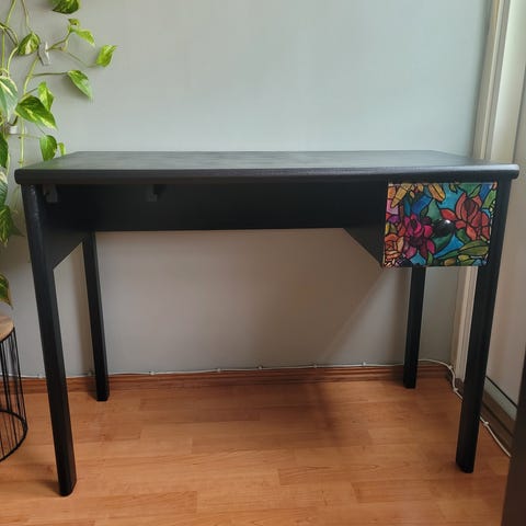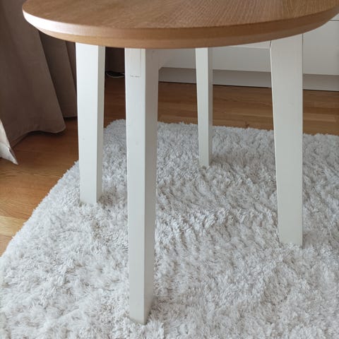 Tässä sirossa puisessa pöydässä on pyöreiksi sorvatuista, alaspäin leviävistä pinnoista tehdyt jalat ja niissä jokaisessa kaksi pyöreää tukipuuta. Tukipuita puuttuu yksi kahdesta vastakkaisesta jalasta. Pöytä on tästä johtuen hieman hutera, mutta on toiminut hyvin käytössä työpöytänä alaspäin leviävien jalkojen johdosta.