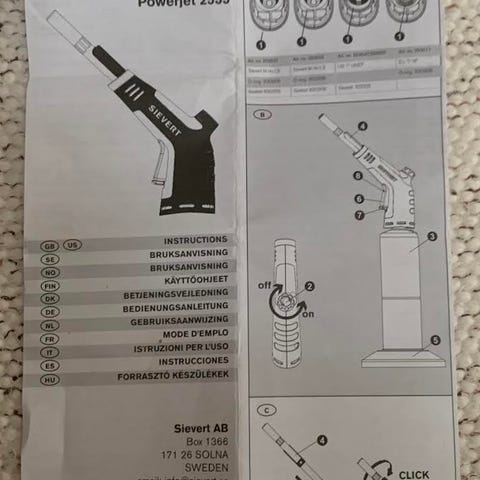 Uusi Sievertin puhalluslamppu paketissa, sis. pistoolin ja kaasu säiliön.