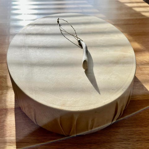 Käsityönä tehty poronnahakainen rumpu ja porontaljasta ja -luusta tehty rumpukapula.