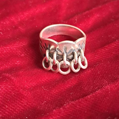 Kalevala Lapin sormus, hopeaa. Halkaisija 17mm. Ei enää mallistossa.