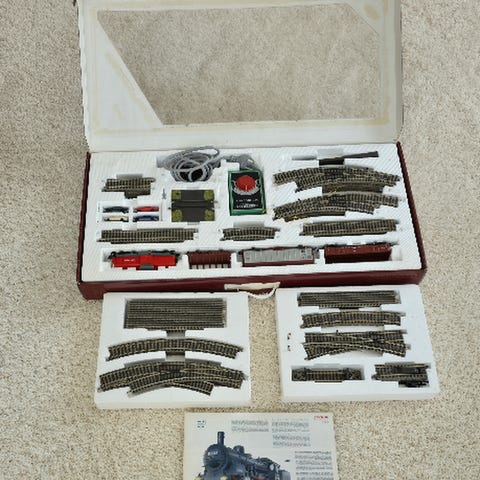 1960-luvun Märklin-merkkinen sähköjunarata, veturi ja vaunuja. Saman ikäinen Trix-merkkinen sähköjunarata, veturi ja vaunuja. Valmistettu Länsi-Saksassa. Esineet itse lähes täydellisessä kunnossa, pakkauksissa iän merkkejä. Sisältää kymmeniä radan osia, muuntaja/ohjausyksiköt, kaksi veturia ja useita vaunuja.