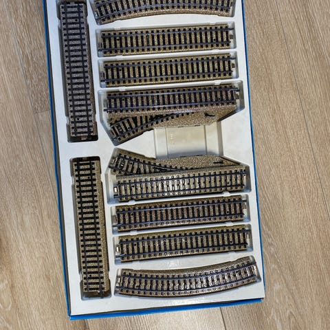 Muuntaja/ohjausyksikkö, radan osat, veturit ja vaunut.