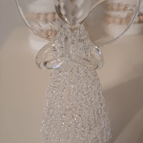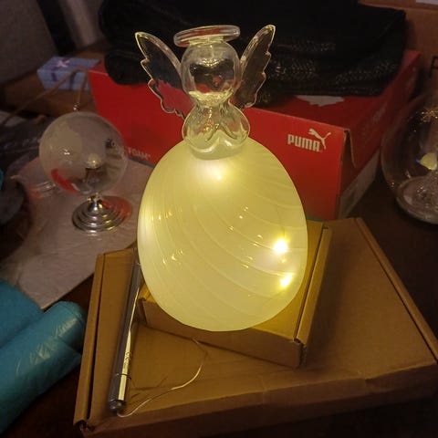 Käyttämätön lasinen Enkelipallo valolla. Korkeus noin 12 cm ja leveys noin 12 cm, leveys pohjasta 9 cm. Vain NOUTO, ei varauksia.