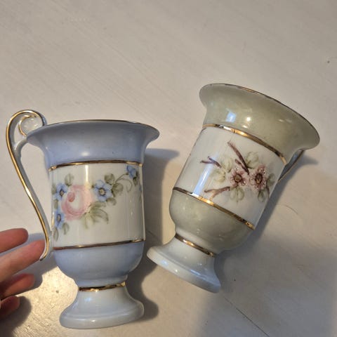 Käsin (ainakin luulisin näin) kultamaalilla koristeltuja, vaalea pohja. Kuppien sisälle maalattu maisemakuvat.