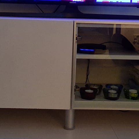 Valkoinen Bestå sarjan lipasto, sivulle avautuvilla ovilla. Säädettävät jalat ja ovet.