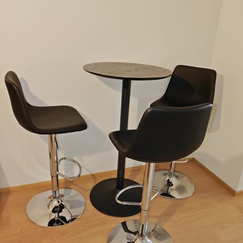Baaripöytä ja neljä baarituolia. Pöydän mitat noin 69,5 x 126,5 cm, korkeus noin 105 cm. Tuolien istuinkorkeus noin 76 cm. Pöydässä suorakaiteen muotoinen musta kansi ja tukevat jalat. Tuoleissa musta istuinosa ja puunsävyiset jalat metallisella jalkatuella. Sopii esimerkiksi keittiöön tai oleskelutilaan baaripöytäryhmäksi.