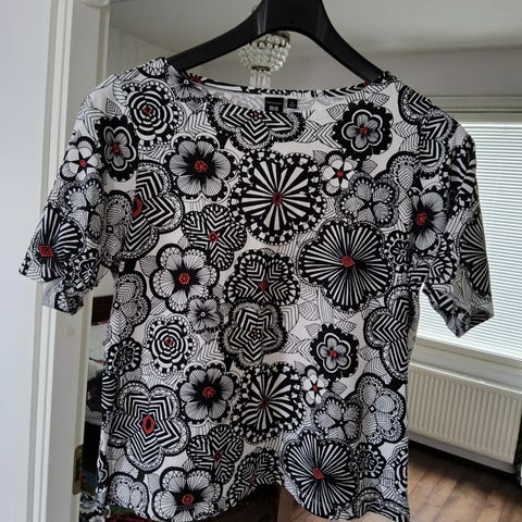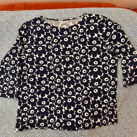 Marimekon pusero, unikko kukat, väri harmahtava turkoosi. Materiaali froteemainen. Tuotelappua ei ole. Hyvä kunto, käytetty. Mitat k-k 58 cm, o-h 64 cm.