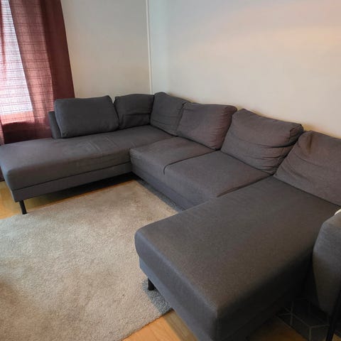 Myydään mukava ja tilava kulmasohva, jossa divaaniosan alla kätevä vuodevaatelaatikko. Sohva on syvä ja rento istua, mutta sopii hyvin myös pienempiin tiloihin.