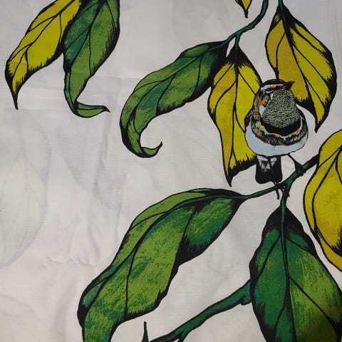 Ihanan keväinen Vallilan verho- tai pöytäliinakangas. Leveys 150 cm, pituus 4.48 m, puuvilla-polyesteriä. Säilytetty siististi kangaskaupan pahvirullan ympärille käärittynä sekä muovipussin sisällä. Hinta postituskuluineen 65 e.