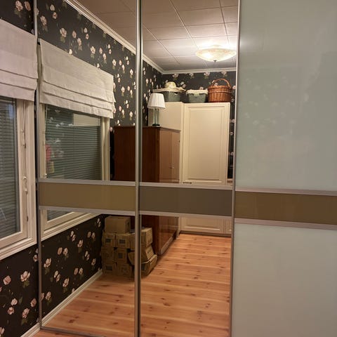 Hyväkuntoiset peililiukuovet 2 kpl koristeraidalla. Kokonaiskorkeus 255 cm, kiskojen pituus 133 cm.