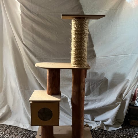 Vaalea raapimapuu, joka jäi käytännön käyttämättömänä omalle kissalle pieneksi. Puussa useita pylväitä, jotka soveltuvat kiipeilyyn ja kynsien teroittamiseen, riippukori lepäämiseen ja ylimmästä tasosta roikkuu pehmeä pallo leikkimistä varten. Tässä oiva valinta kissanpennulle ensiraapimapuuksi 🐾