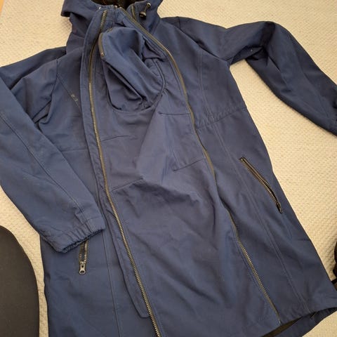 Naisten softshell kantotakki, koko L (leveys n. 60cm kainalossa ilman lisäpaneelia). Punainen, pitkä malli, jossa huppu ja vetoketjukiinnitys edessä. Lisäpaneeli irrotettavissa. Sopii arkeen ja ulkoiluun leudommilla keleillä.
