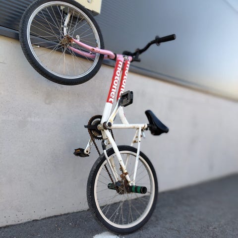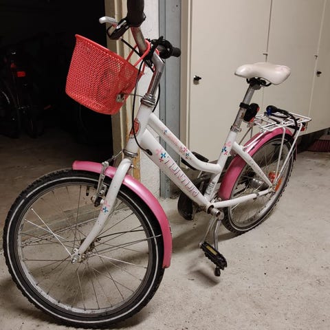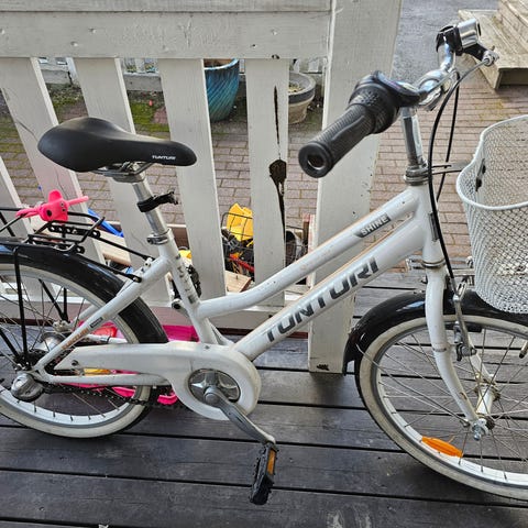 Tyttöjen 20 tuumainen polkupyörä. Hieman ruostetta ja vihreää ”levää” korissa, joka ei lähtenyt pesussa. Vielä hyvä pyörä, vaikka mummolaan. Mmm.