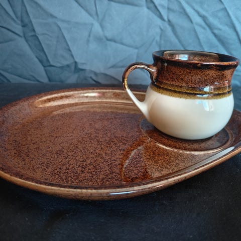 Kermansavi aamiaisetti: muki ja lautanen. Hyvässä käytetyssä kunnossa, en löytänyt huomautettavaa.