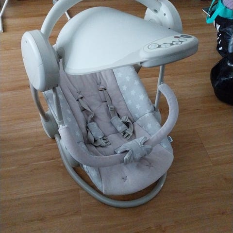 Gracon Snuggleswing-vauvakeinu. Itsekoottava. Ohjekirja mukana. Hyväkunto. Ollut käytössä yhdellä lapsella.