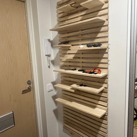Puinen seinähylly. Kätevät ripustusnupit alareunassa. Reiät kiinnitykseen yläreunassa. Hinta 20e. Vain nouto Raksilasta.