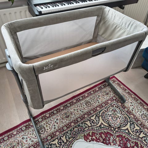 Joie sivuvaunusänky vauvalle. Sängyssä on harmaat tekstiiliosat ja metallinen runko. Toinen laita voidaan avata, jolloin sänkyä voi käyttää vanhempien sängyn vieressä sivuvaununa. Pohjassa on patja, ja sivuissa on verkkokangasta, joka parantaa ilmanvaihtoa ja näkyvyyttä lapseen. Sänky soveltuu vastasyntyneelle ja pienelle vauvalle nukkumispaikaksi. Korkeutta ja jalkojen asentoa voi säätää, jotta sänky saadaan sopimaan eri sänkykorkeuksiin ja lattioille.