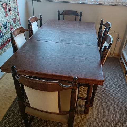 4kpl tuoleja + valkoinen pöytä. Käytön jälkeä löytyy enemmän ja vähemmän, mutta toimiva setti.